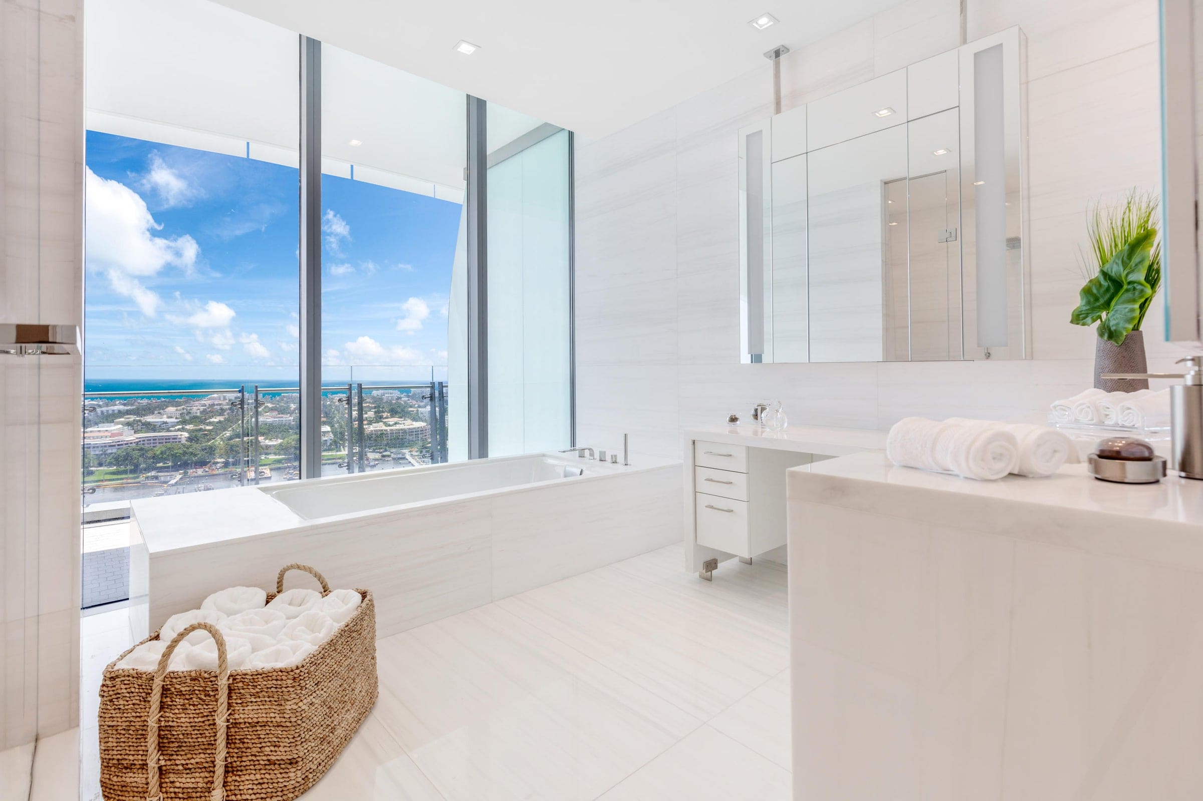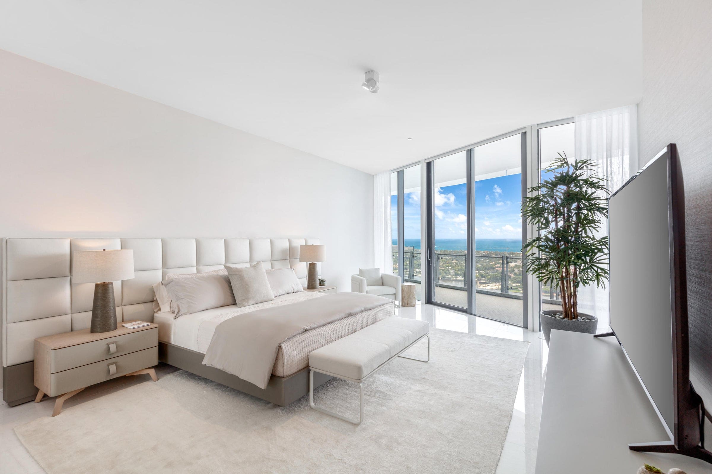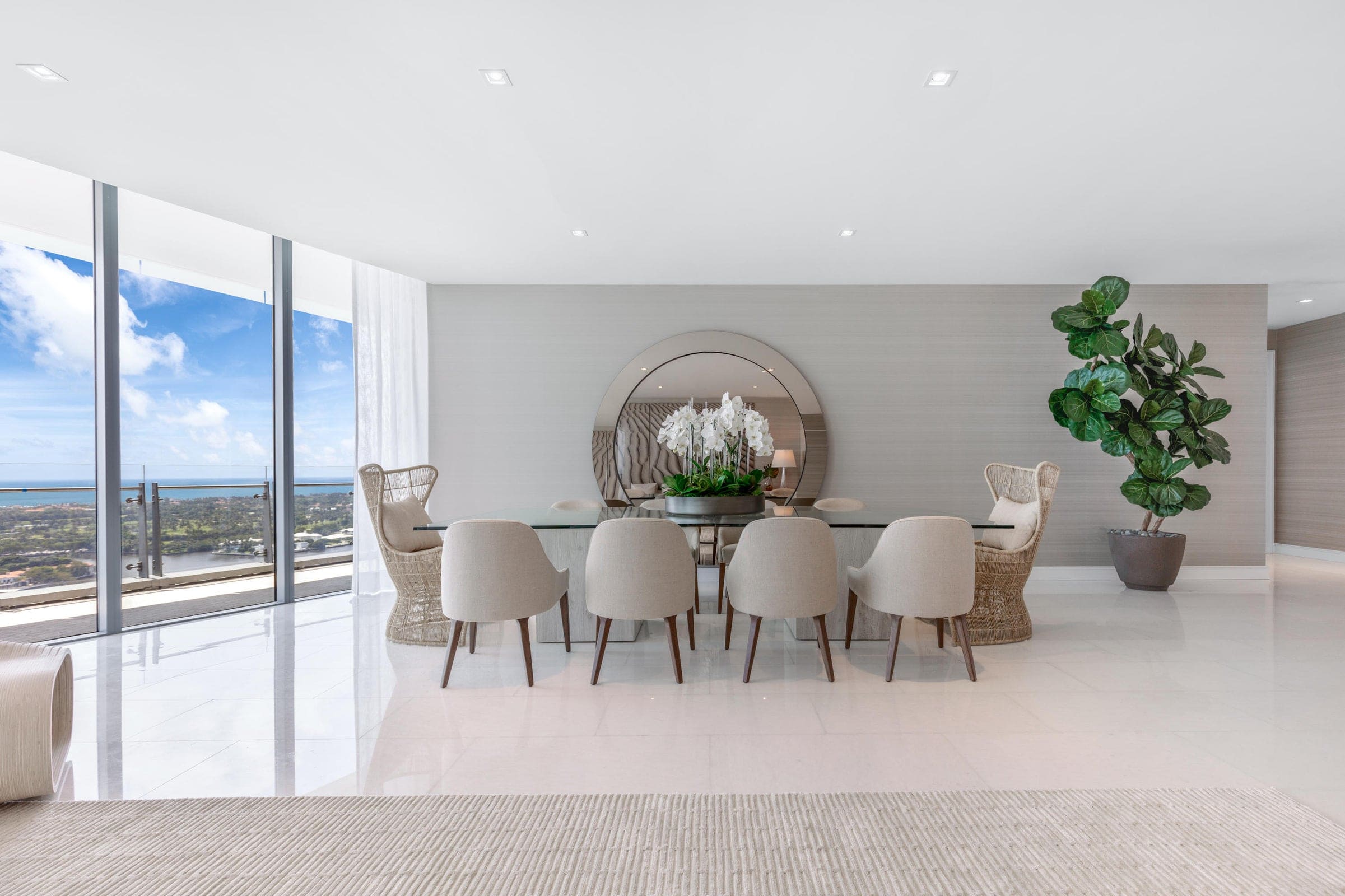 A sophisticated waterfront apartment designed with a refined coastal-modern aesthetic, where floor-to-ceiling glass frames sweeping ocean and skyline views. A soft neutral palette, custom furnishings, and sculptural elements create a serene interior that blends contemporary luxury with the surrounding coastal landscape.