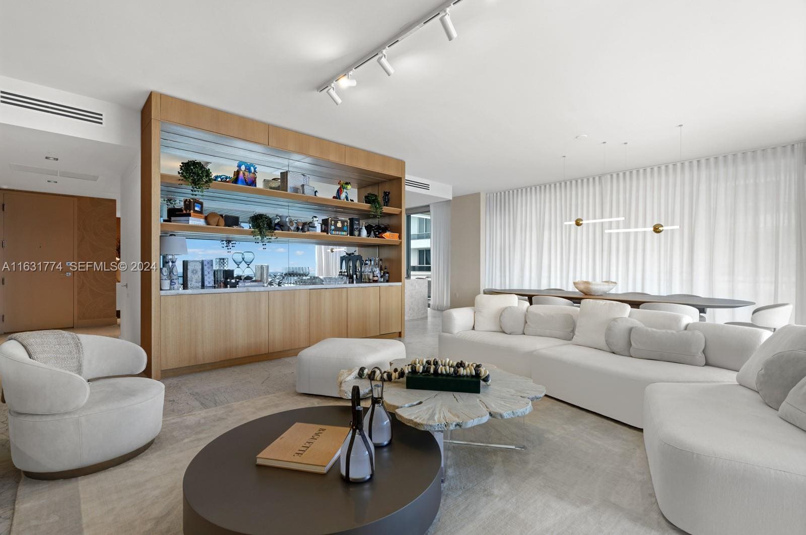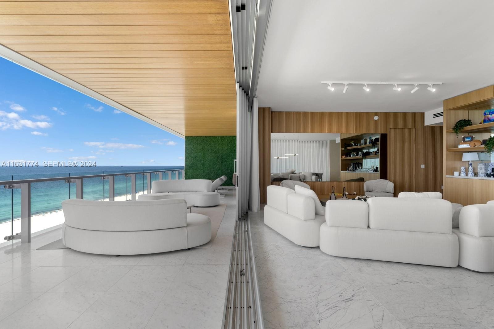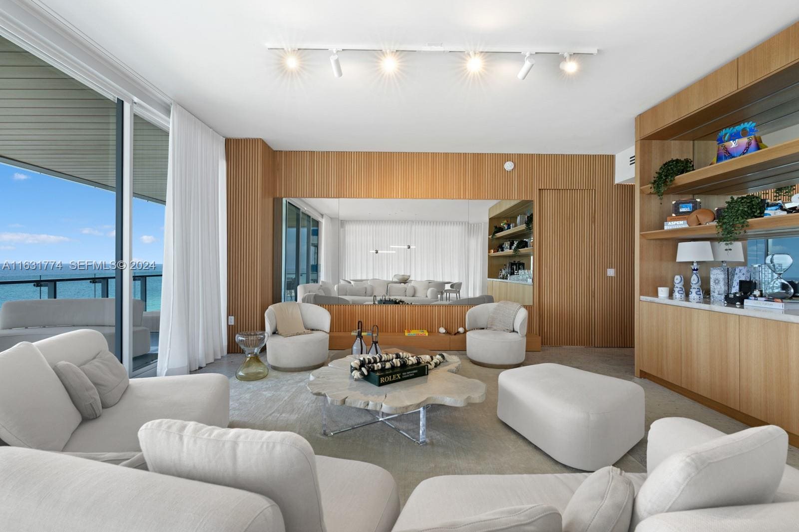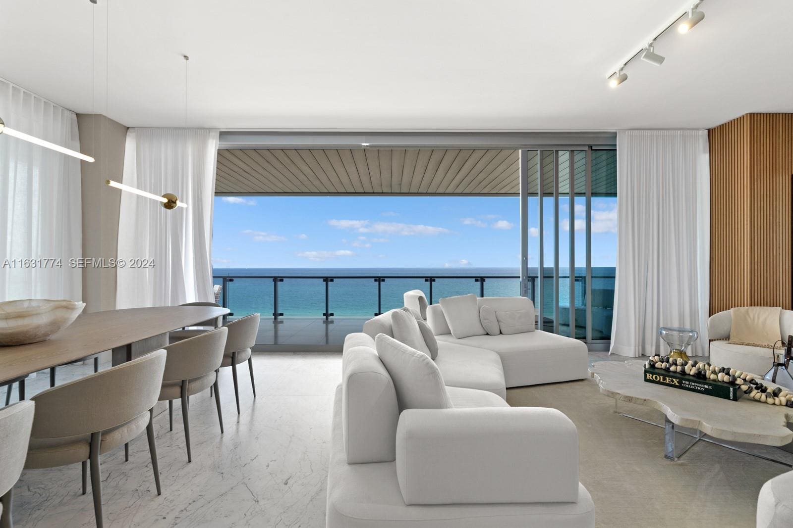 A refined oceanfront residence designed to highlight uninterrupted views of the Atlantic through expansive glass and a calm, minimalist palette. Soft neutral furnishings, warm wood textures, and sculptural lighting create a sophisticated coastal atmosphere that blends indoor living with the surrounding ocean landscape.